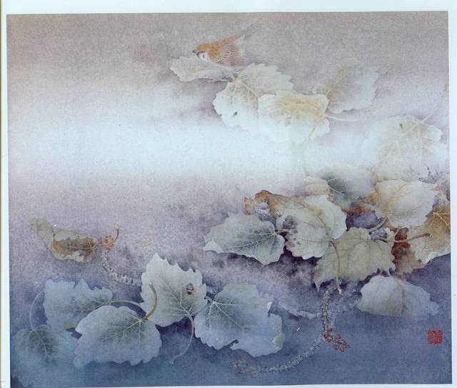 金葉子的脈絡很清晰,與畫中的葉交相輝映,一片溫暖,陽光很朦朧,金燦燦的光籠罩在畫上,幾點墨漬,營造了一個奇異之界,如在夢中。