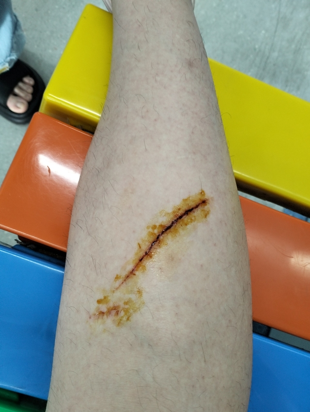 一道長長的口子正在流血。給旁邊那個放梯子的小哥嚇得急忙打電話求助去了,還給我拿了紙到隔壁的快遞站讓我坐下。