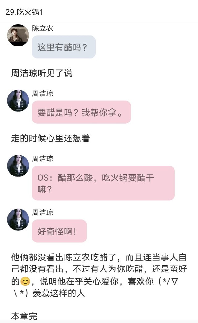 周潔瓊看他這個樣子,抽起紙巾幫她擦額頭,陳立農(nóng)看著她對瀟瀟寵溺的眼神,兩人的“打情罵俏”(其實應(yīng)該是閨蜜之間的打打鬧鬧),心里酸溜溜的,醋意由生,所以醋派上了用場,就在她幫她擦額頭的那幾個分鐘,醋已經(jīng)被消滅完了一半,永遠(yuǎn)不要低估男人吃醋時力量,你永遠(yuǎn)不知道他們吃醋起來有多可怕??