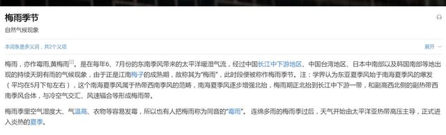 梅雨,亦作霉雨,黃梅雨 。是在每年6、7月份的東南季風(fēng)帶來的太平洋暖濕氣流,經(jīng)過中國長江中下游地區(qū)、中國臺灣地區(qū)、日本中南部以及韓國南部等地出現(xiàn)的持續(xù)天陰有雨的氣候現(xiàn)象,由于正是江南梅子的成熟期,故稱其為“梅雨”,此時段便被稱作梅雨季節(jié)。